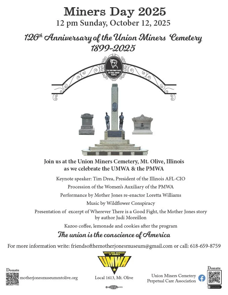 Illinois AFL-CIO President Tim Drea, activist Pam Monetti, and UMWA Local #1613 Scott Thomas will be the main speakers at Union Miners’ Cemetery in Mt. Olive, IL, on Oct. 12. The ceremonies start at noon with a short historical parade. Afterward, snacks will be provided as labor music plays. The event is free and open to the public. A portable chair is recommended.